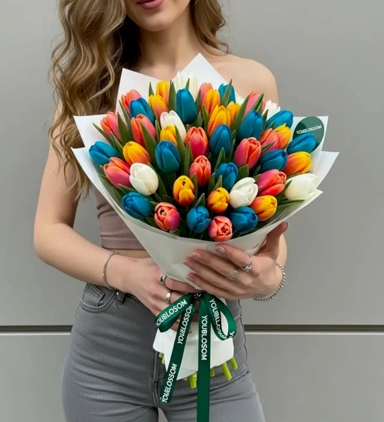 Çiçekçilikte bu kadar çok rengi bir arada kullanırken estetiği korumak ustalık ister. Bu eşsiz lale buketi, karmaşık ambalajlardan uzak durularak tamamen temiz, beyaz premium kağıtla sarmalanmıştır. Beyaz kağıdın sade arka planı, lalelerin canlı renklerini adeta bir ressamın tuvali gibi ön plana çıkarır. Buketi tamamlayan ve kalite algısını zirveye taşıyan o koyu zümrüt yeşili YouBlossom kurdelesi ise, hediyenizin "Lüks ve Butik" karakterini mühürler.