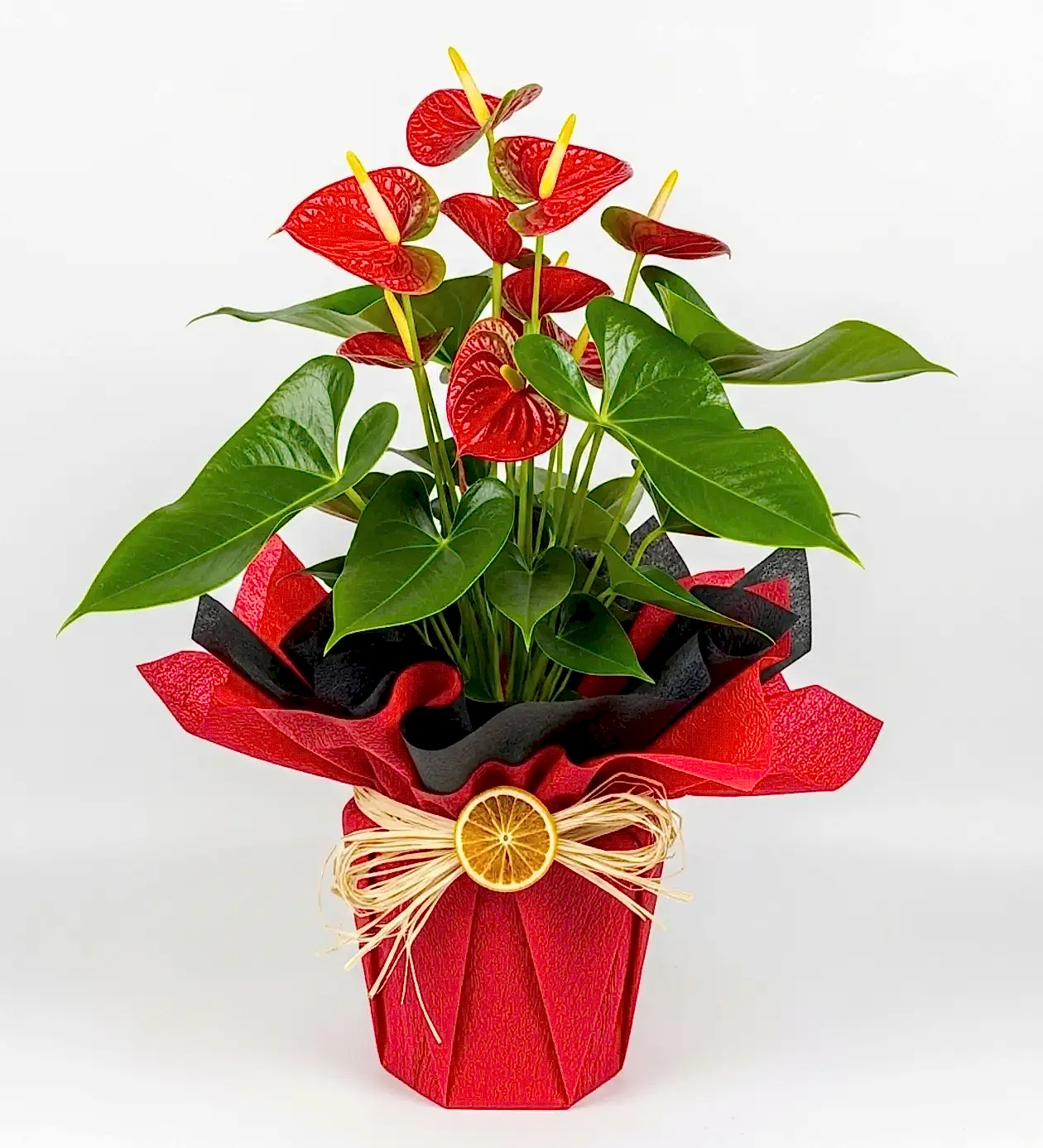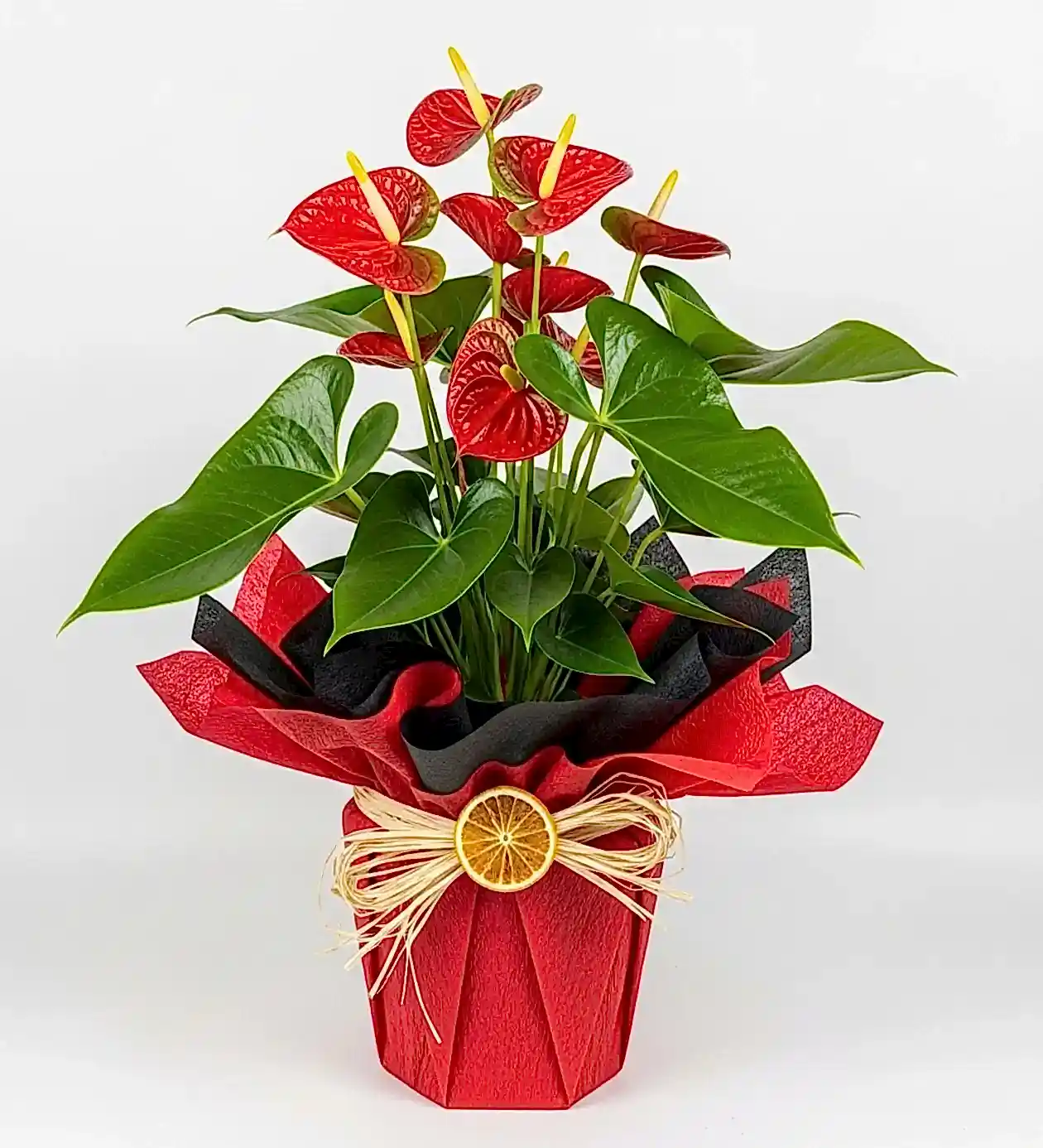Şekliyle kalbi andıran çiçekleriyle bilinen anthurium, sevginizi zarif ve uzun ömürlü bir biçimde ifade etmenin en egzotik yoludur. Bu özel tasarımda yer alan kırmızı anthurium çiçeği, geniş ve parlak yeşil yapraklarıyla birlikte saksıda sunulmuştur. Bitkinin çarpıcı görünümüne eşlik eden siyah ve kırmızı renkli ambalaj, alt kısmındaki rafya ip ve kuru portakal dilimi detayıyla tamamlanmıştır.