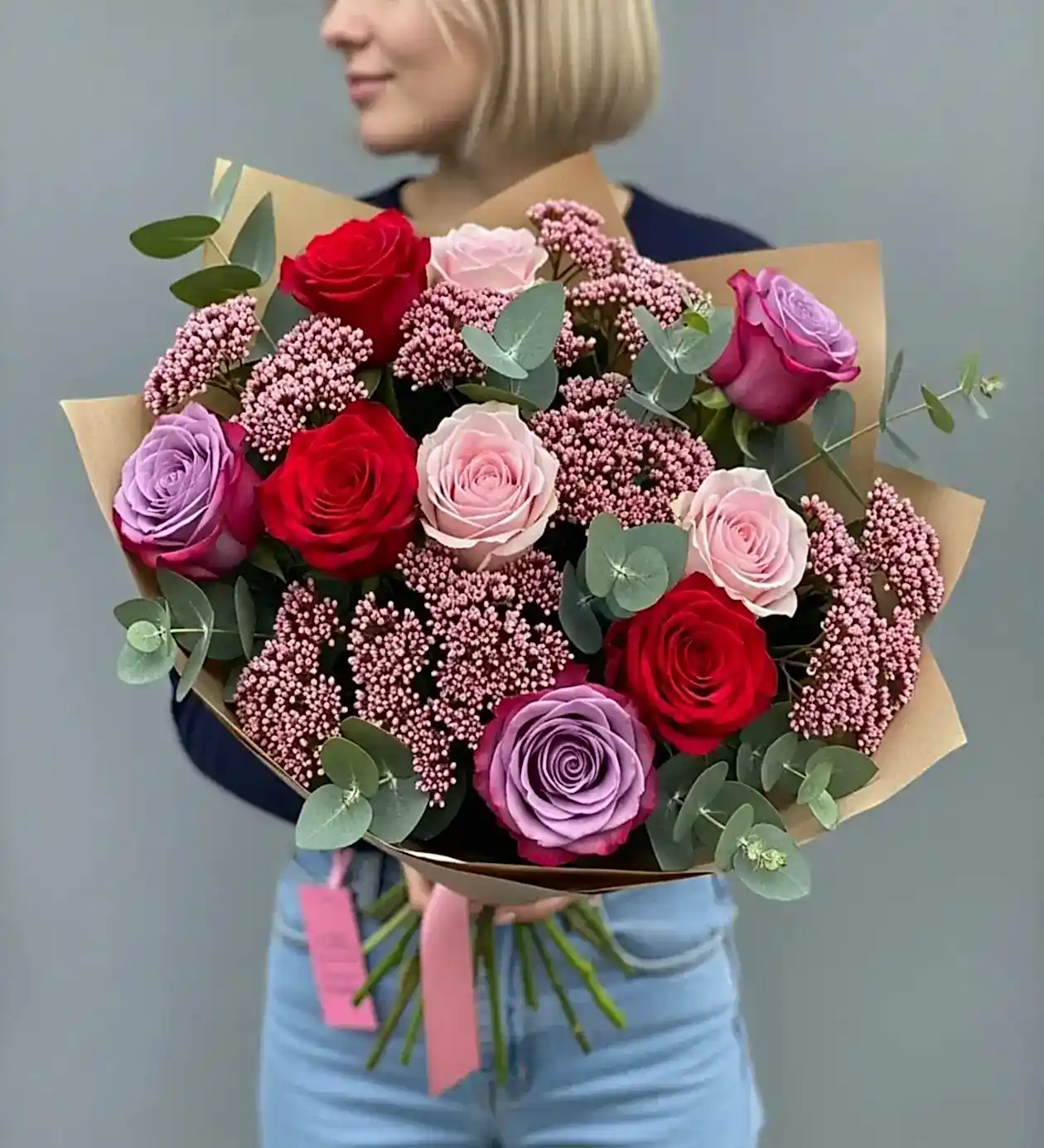 Romance Bloom Bouquet – Kırmızı, Pembe ve Lila Gül Buketi