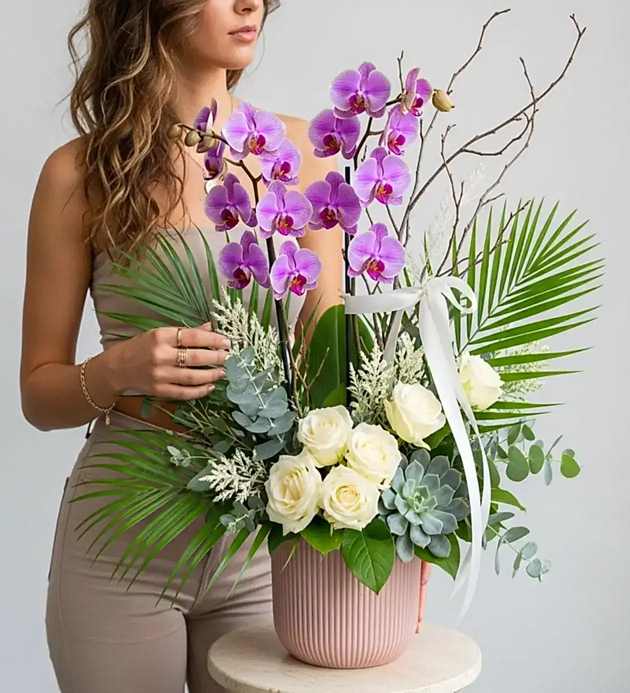 YouBlossom’un premium koleksiyonunda yer alan Royal Purple Orchid, yalnızca estetik bir aranjman değil, aynı zamanda zarafetin ve lüksün somut halidir. Mor orkide dalları, beyaz güller ve tropikal yaprakların bir araya gelmesiyle hazırlanan bu aranjman; açılışlardan özel davetlere, romantik sürprizlerden iş kutlamalarına kadar her an için ideal bir seçimdir.
