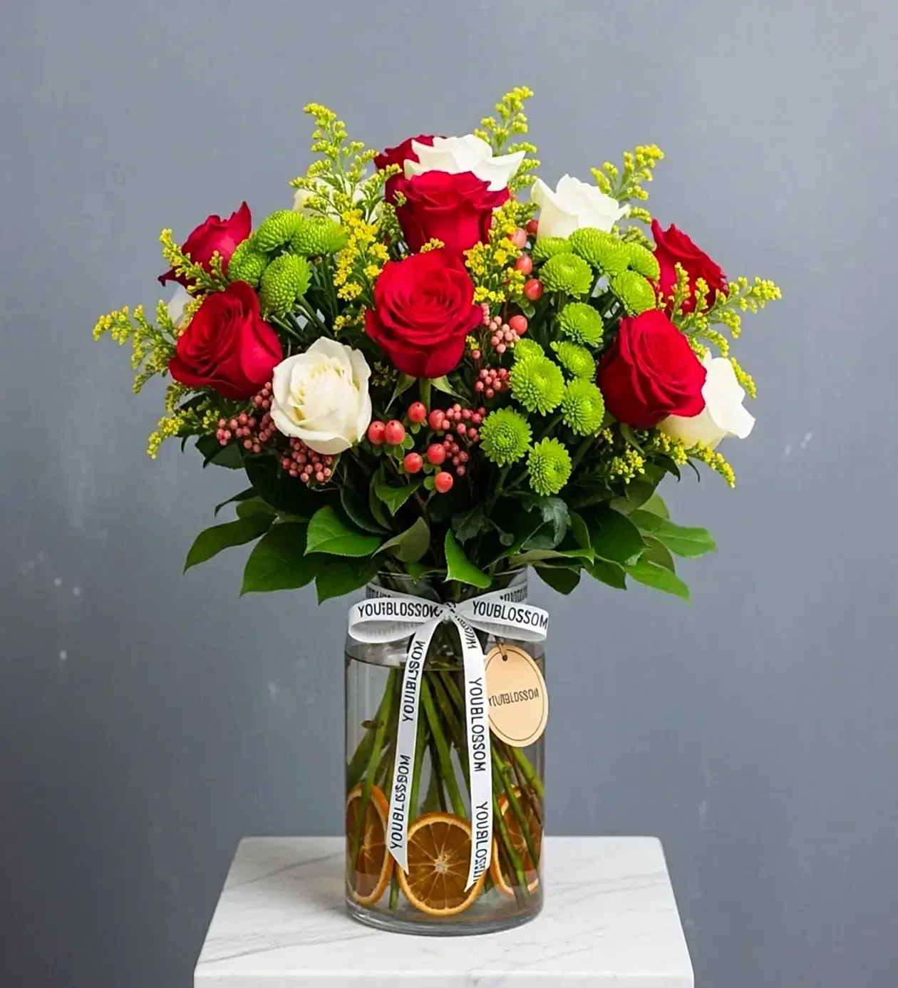 Tutkunun ve Saflığın Modern Buluşması Klasikleşmiş kırmızı ve beyaz gül uyumunu, YouBlossom'un modern ve ferah vizyonuyla yeniden yorumladık. Kırmızı güllerin güçlü ve sıcak enerjisi, beyaz güllerin naif duruşuyla dengelenirken; aralara serpiştirilen taze yeşil ponpon krizantemler (kasımpatı) ve kırmızı hiperikum meyveleri tasarıma adeta kır bahçelerinden kopup gelmiş doğal bir canlılık katıyor. Bu aranjman, derin hislerinizi kalıplaşmış klasiklerin ötesinde, yaşayan ve enerjik bir formda sunmanızı sağlar.