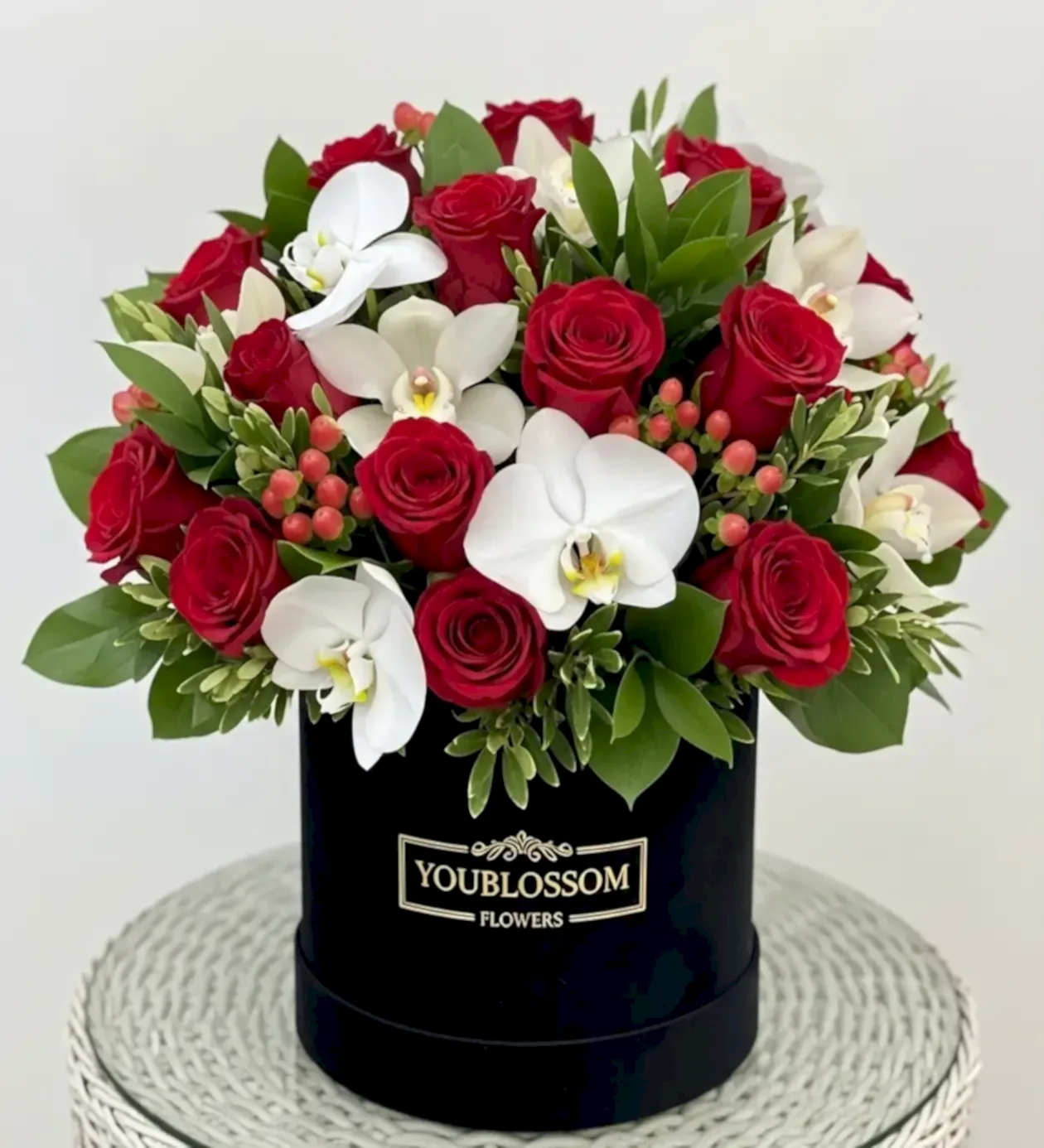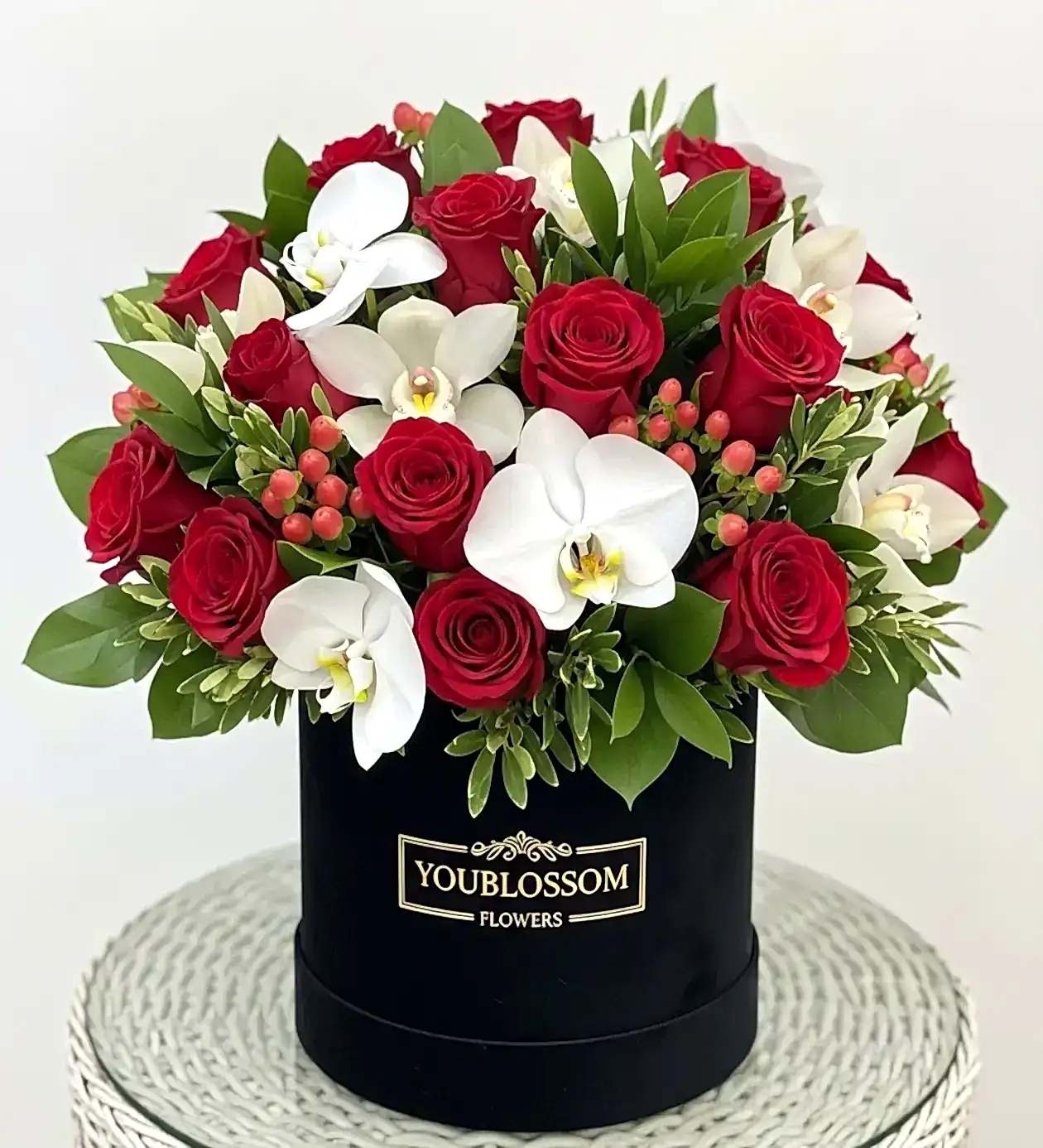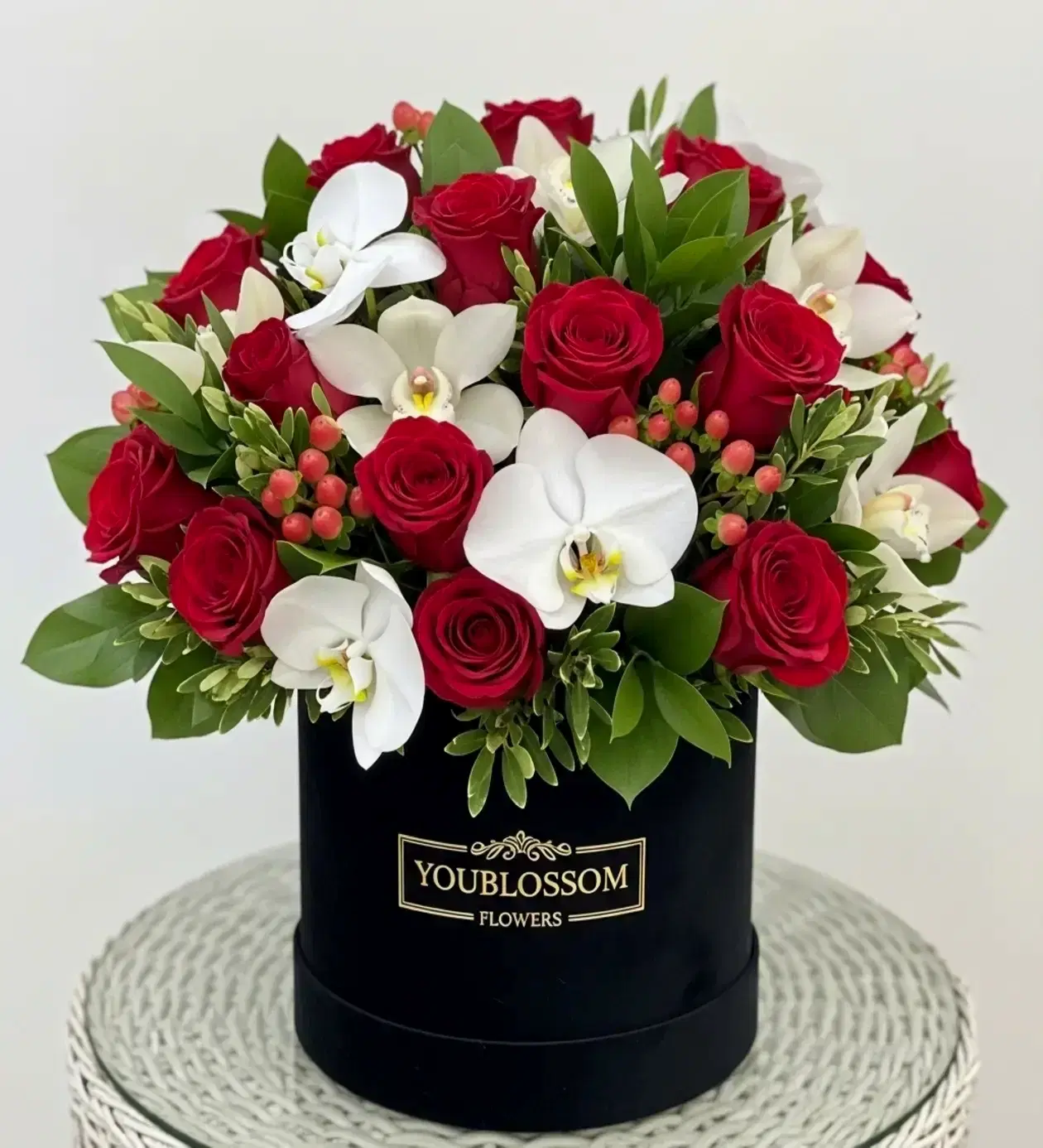 “Aşkın İmzası”, taptaze kırmızı güller, zarif beyaz Phalaenopsis orkide dalları ve yeşil yaprakların ferah dokusu ile hazırlandı.