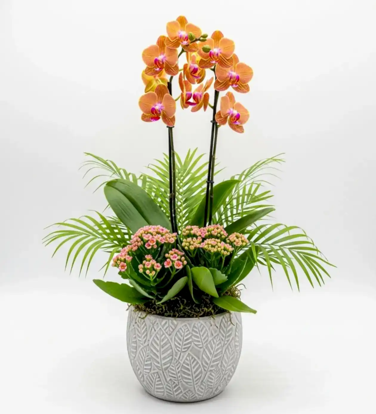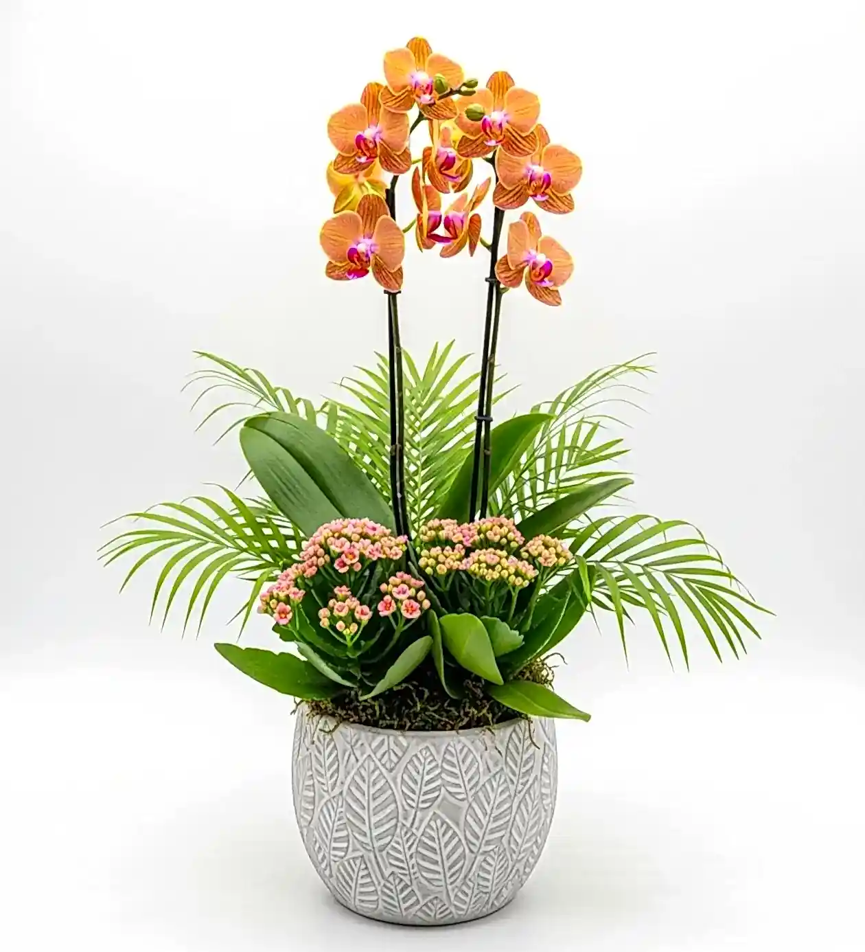 Sıcak renklerin neşesi ve doğanın huzuru bu saksıda buluştu! Gün Işığı Aranjmanı, zarif formuyla öne çıkan turuncu çift dallı orkide, minik ve yoğun çiçeklere sahip pembe kalanchoe bitkileri, dekoratif palmiye yaprakları ve geniş yaprak dokularıyla eşsiz bir görsel denge sunar.
