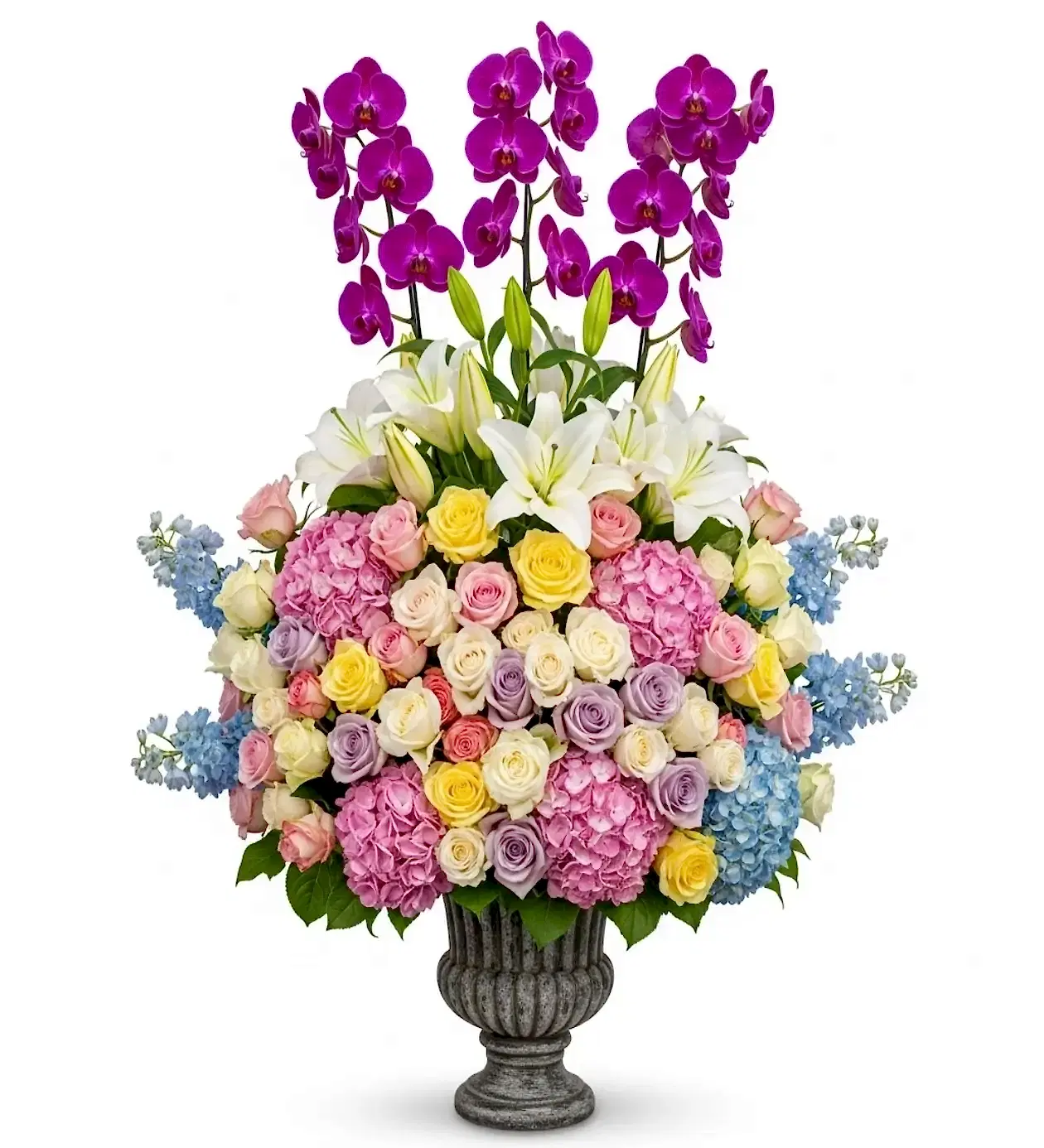 Üst kısmında yer alan 3 adet canlı mor Phalaenopsis Orkide, dikey ve asil duruşuyla göz doldurur. Ortada yükselen beyaz lilyumlar, saflığın simgesi olarak aranjmana hareket katarken; alt kısımdaki pastel tonlu güller (sarı, pembe, beyaz, lila) ve pembe-mavi ortancalar, hacim ve zenginlik sağlar.