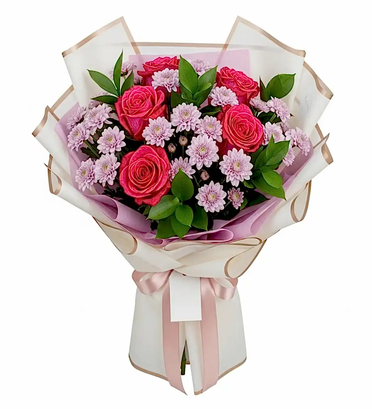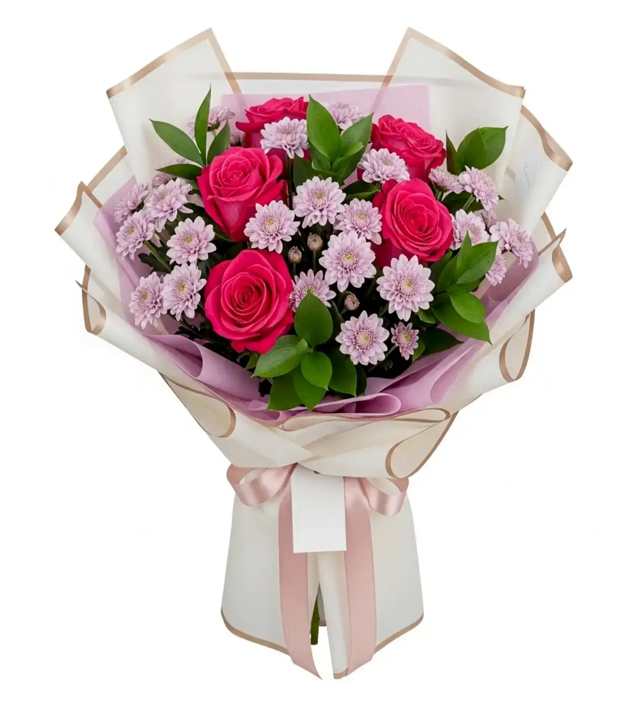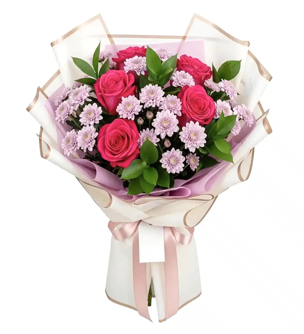 Aşkın Zarafeti, canlı fuşya güller ile yumuşak tonlu lila krizantemlerin göz alıcı uyumuyla hazırlanmış, duygularınıza tercüman olacak özel bir çiçek buketidir.