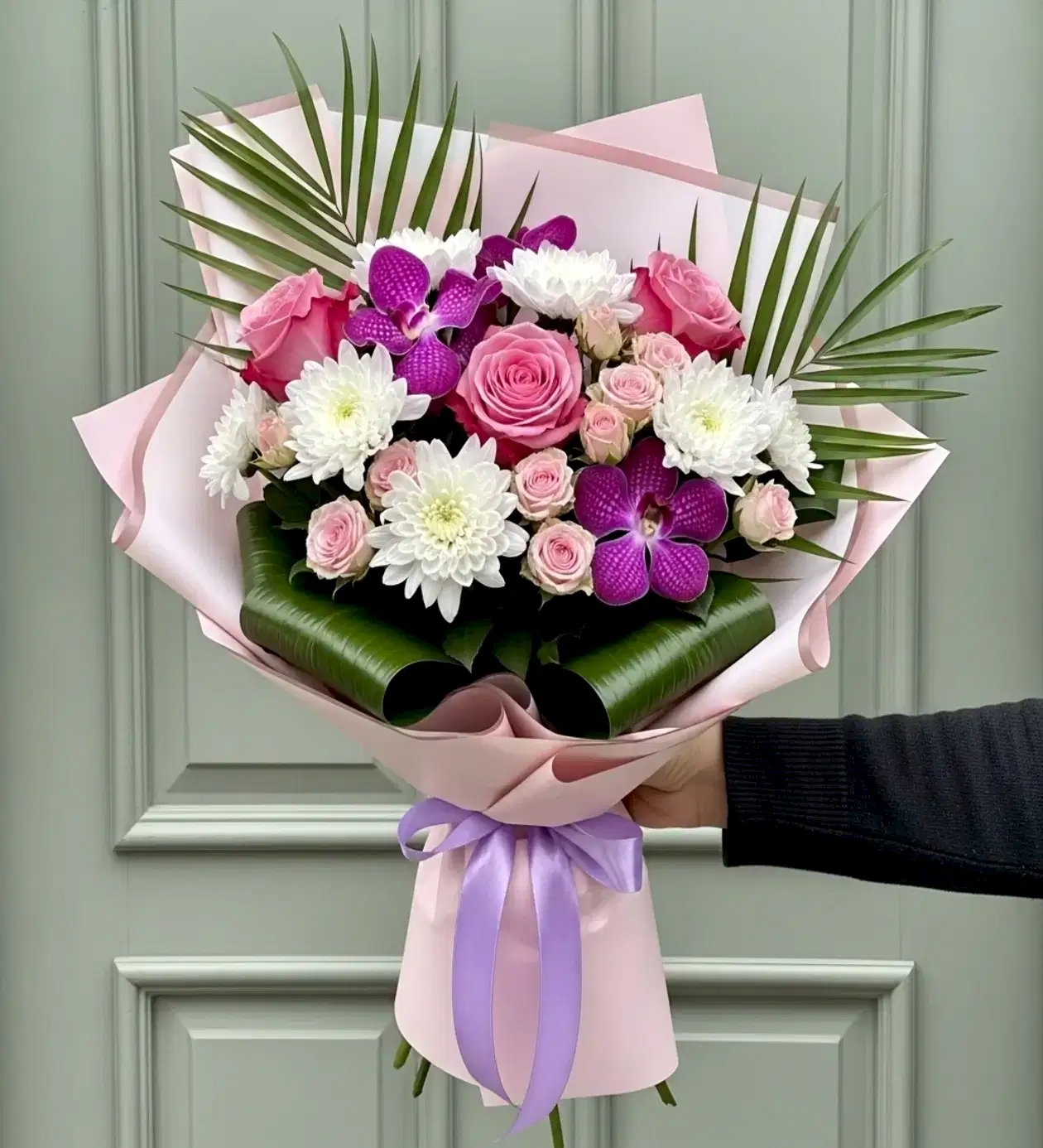 💐 Mor orkide, pembe gül, beyaz krizantem ve mini güller