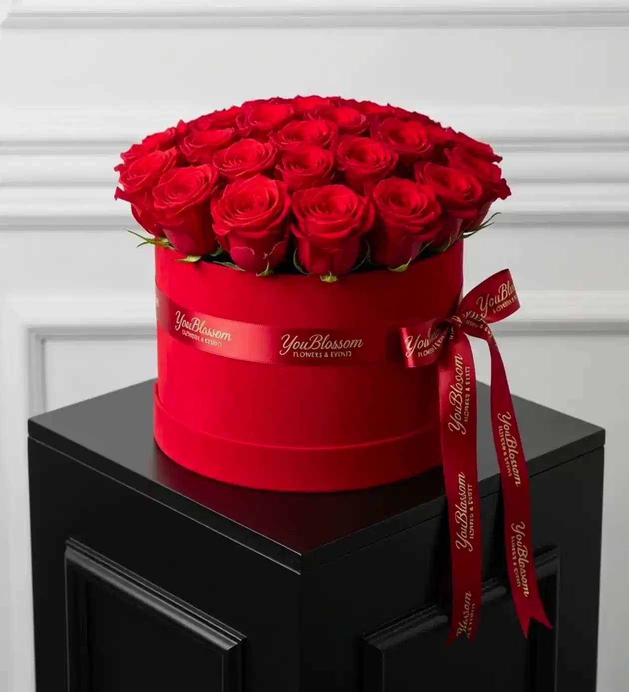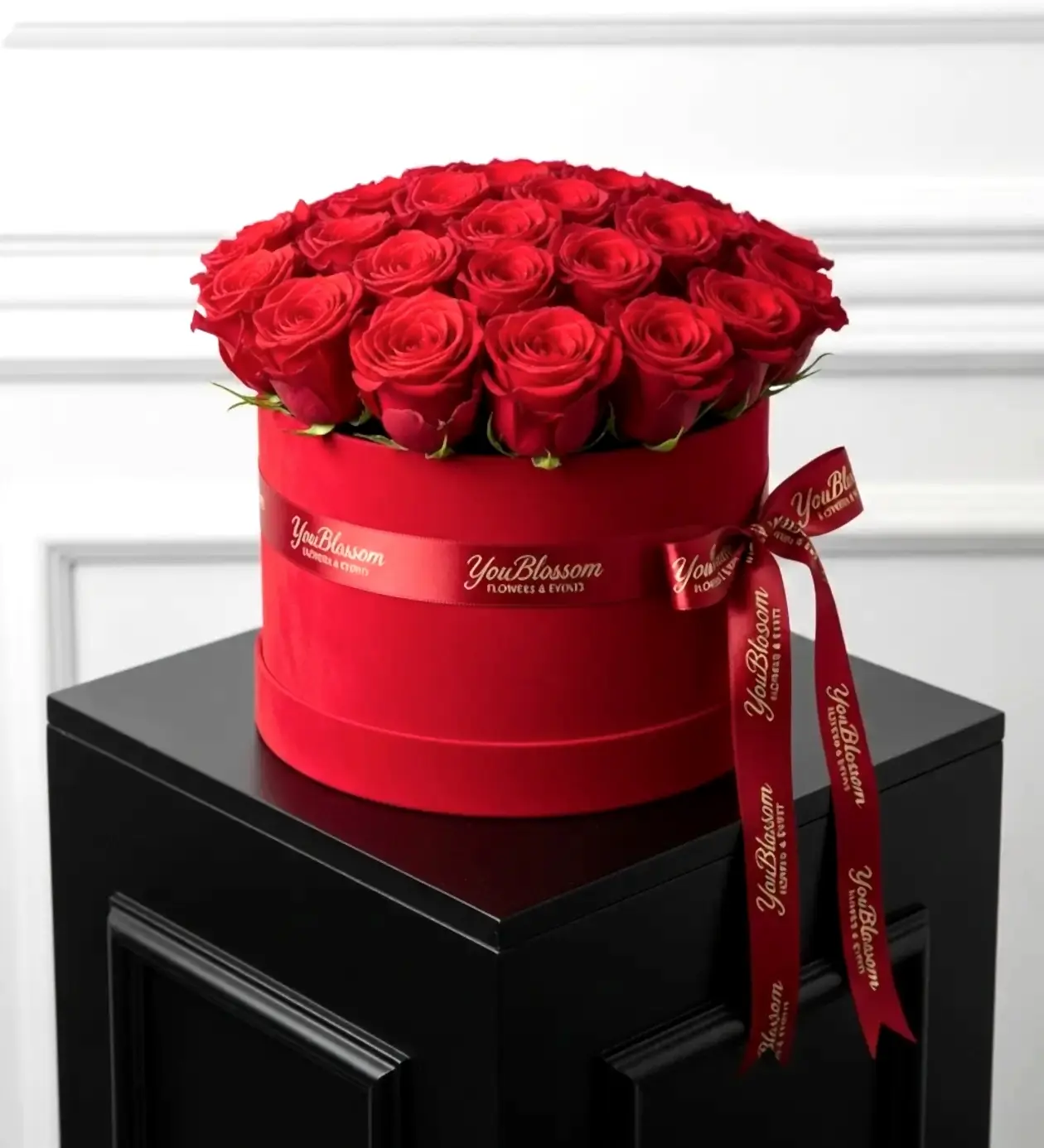 Kutuyu çevreleyen saten YouBlossom logolu kurdele, hem zarif bir sunum hem de markaya özel dokunuş katmaktadır. Bu aranjman, Sevgililer Günü, evlilik teklifi, yıldönümü, doğum günü veya “seni seviyorum” demek için mükemmel bir tercihtir.