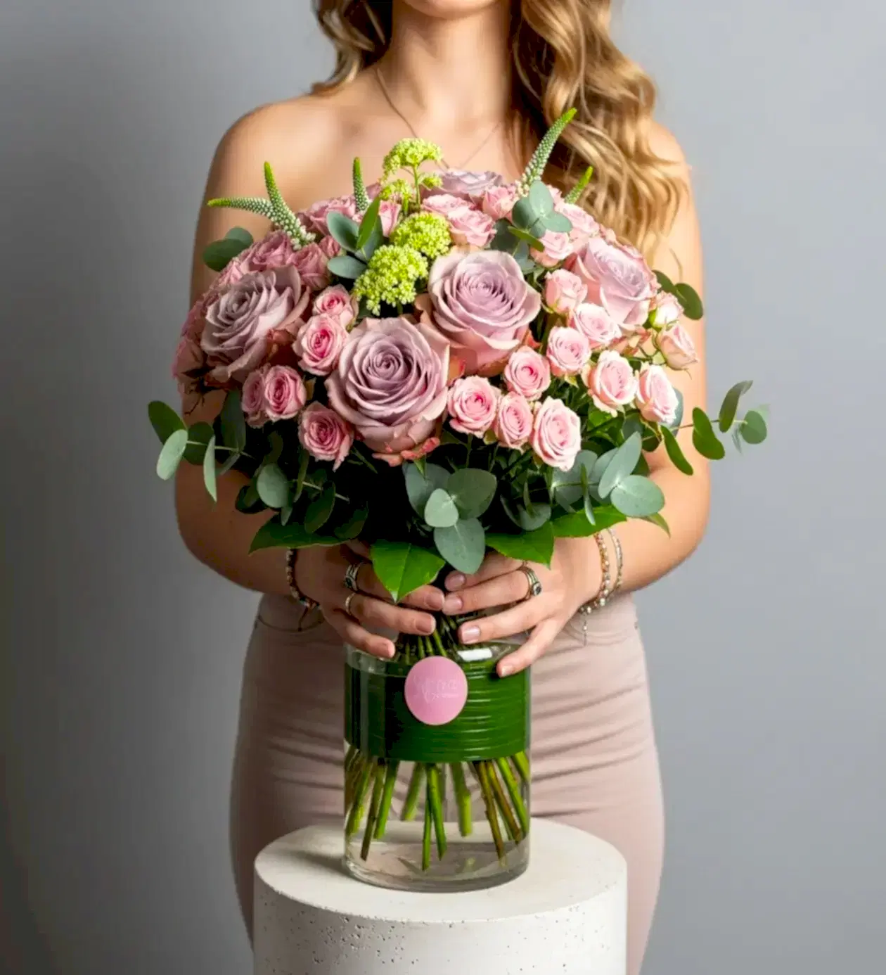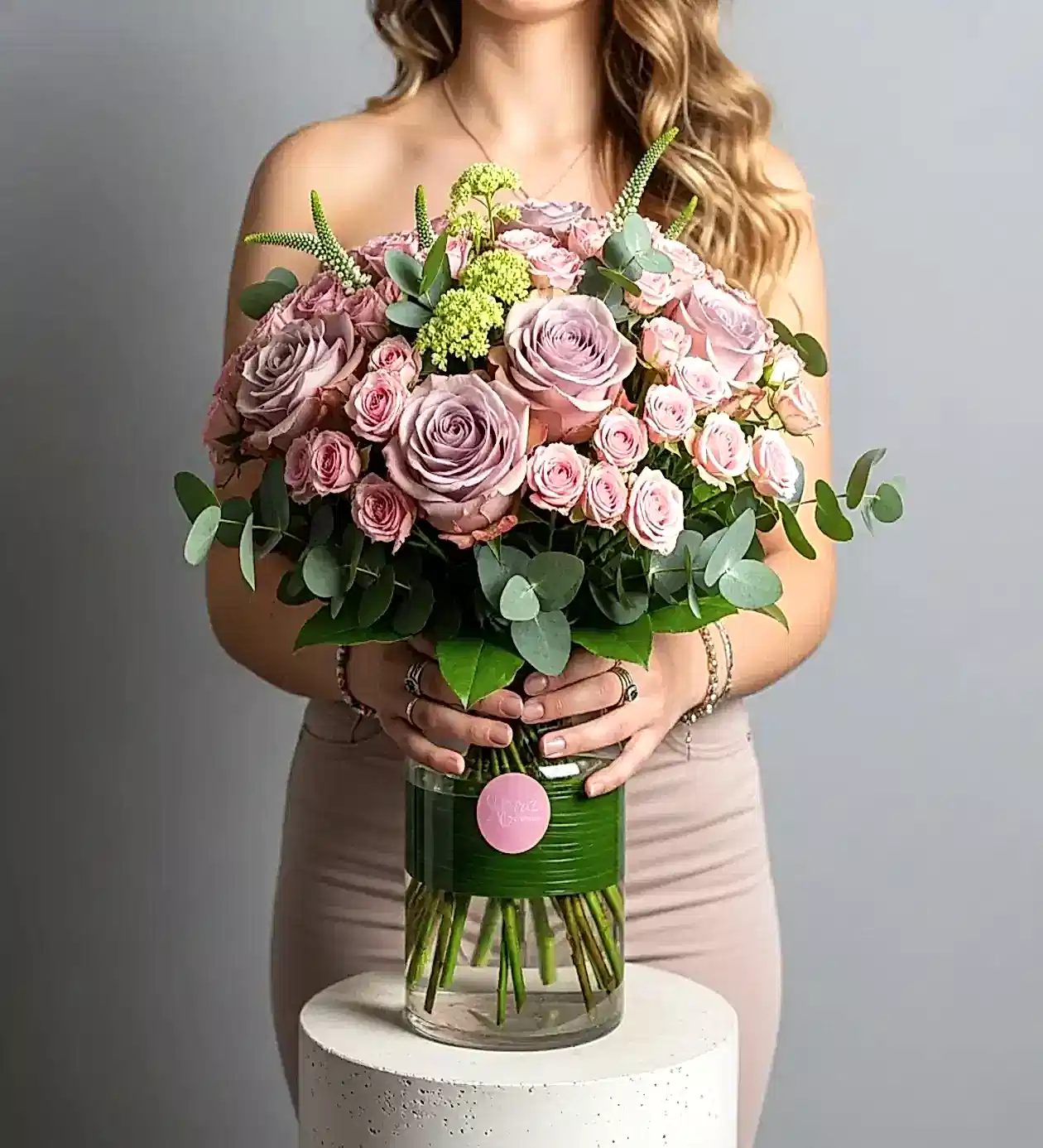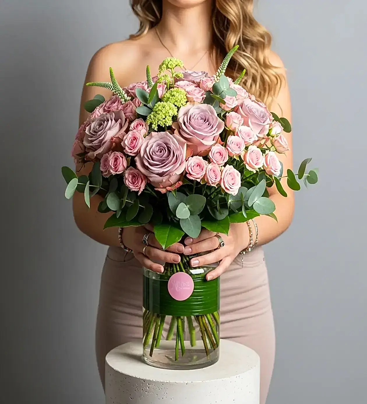 Renk Paleti: Aranjmanın yıldızı olan, pastel lila-pembe arası geçişli büyük baş güller.
