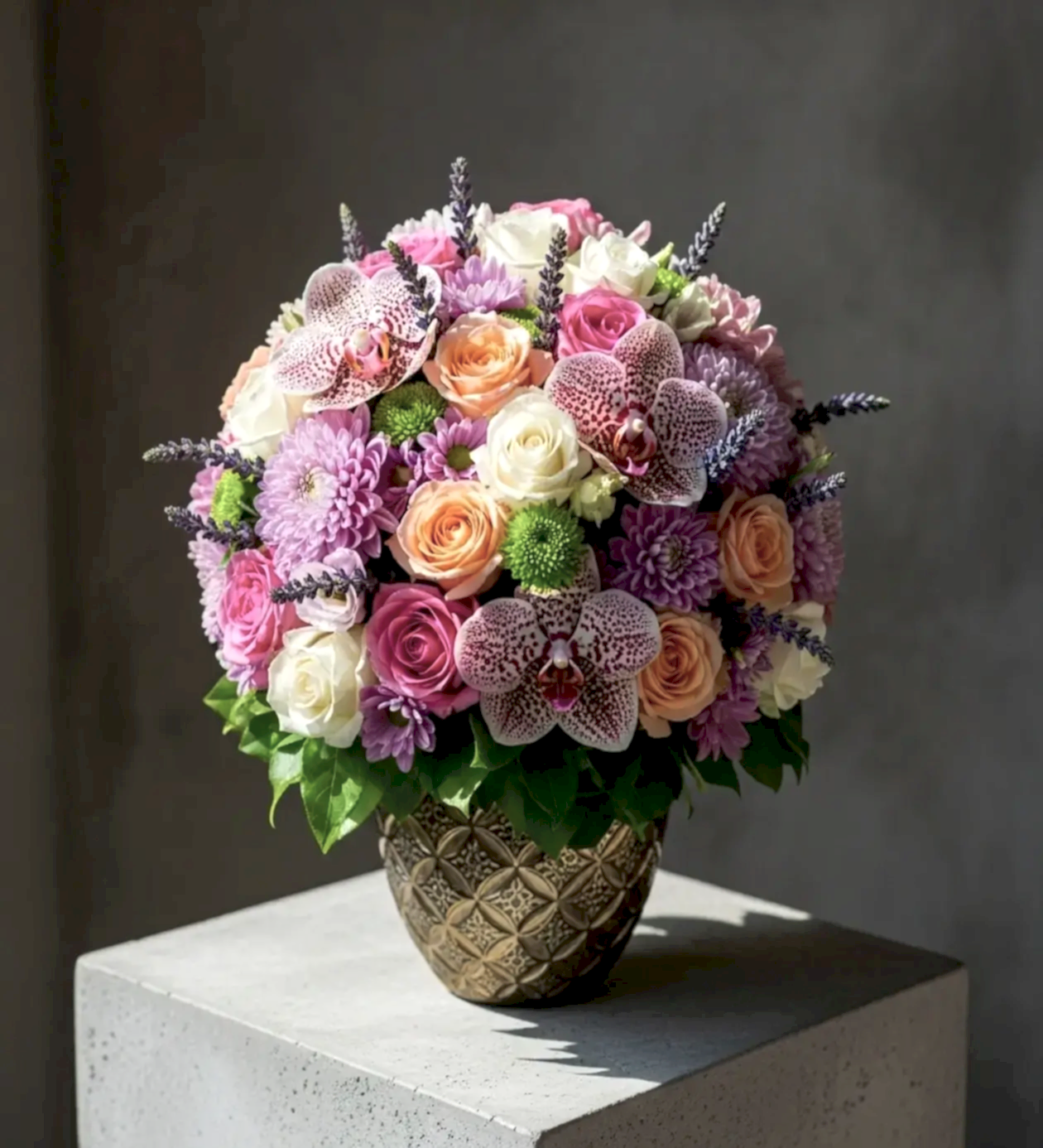 Modern zarafeti klasik dokunuşlarla buluşturan bu göz alıcı orkide ve gül aranjmanı, pastel renk tonlarının dinginliğiyle hazırlanmıştır. İçeriğinde yer alan somon güller, beyaz güller, pembe sprey güller, benekli mor orkide, yeşil ponpon krizantem, lila krizantem ve lavanta dalları, uyumlu bir şekilde desenli bronz tonlu vazo ile tamamlanmıştır.