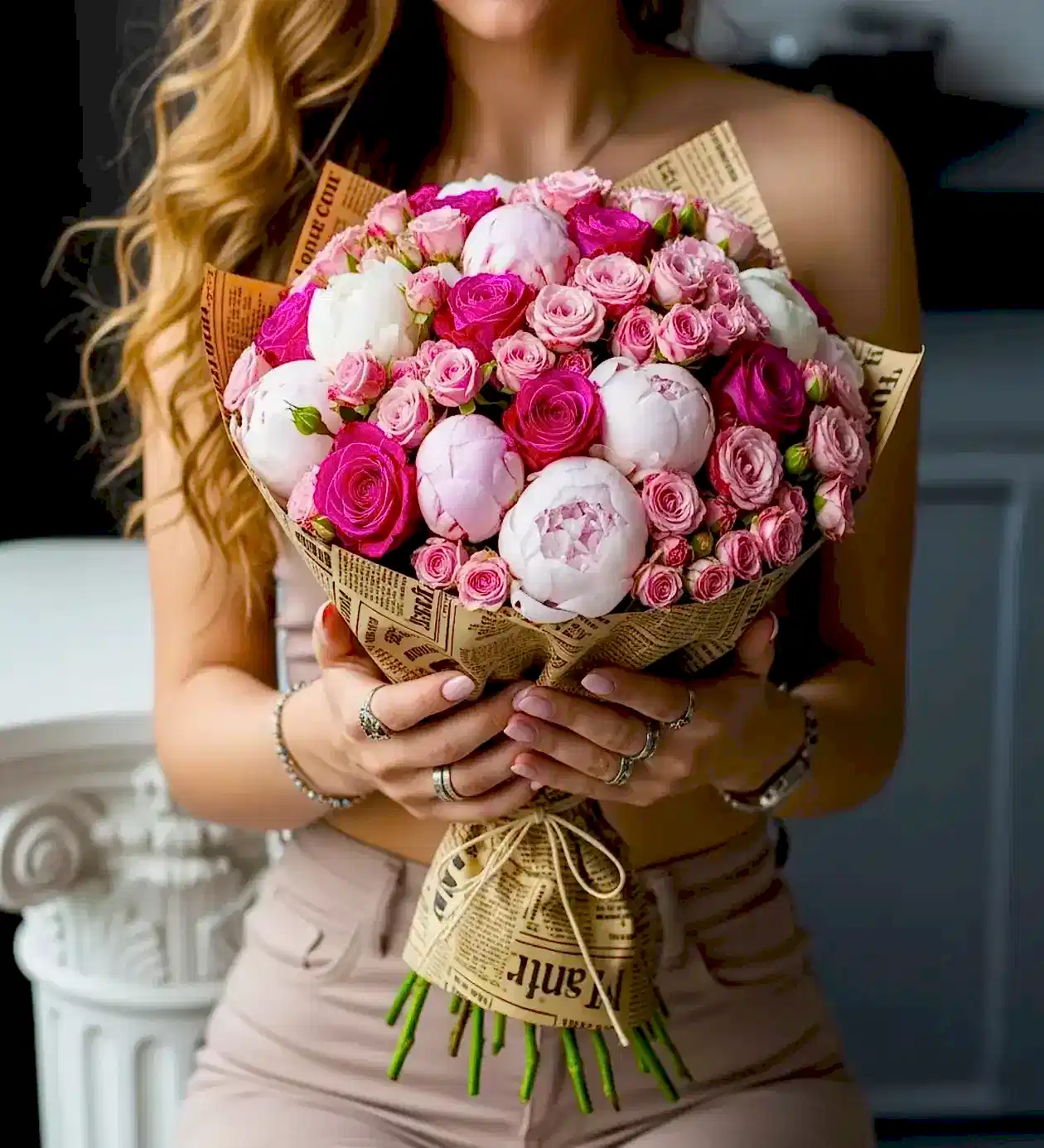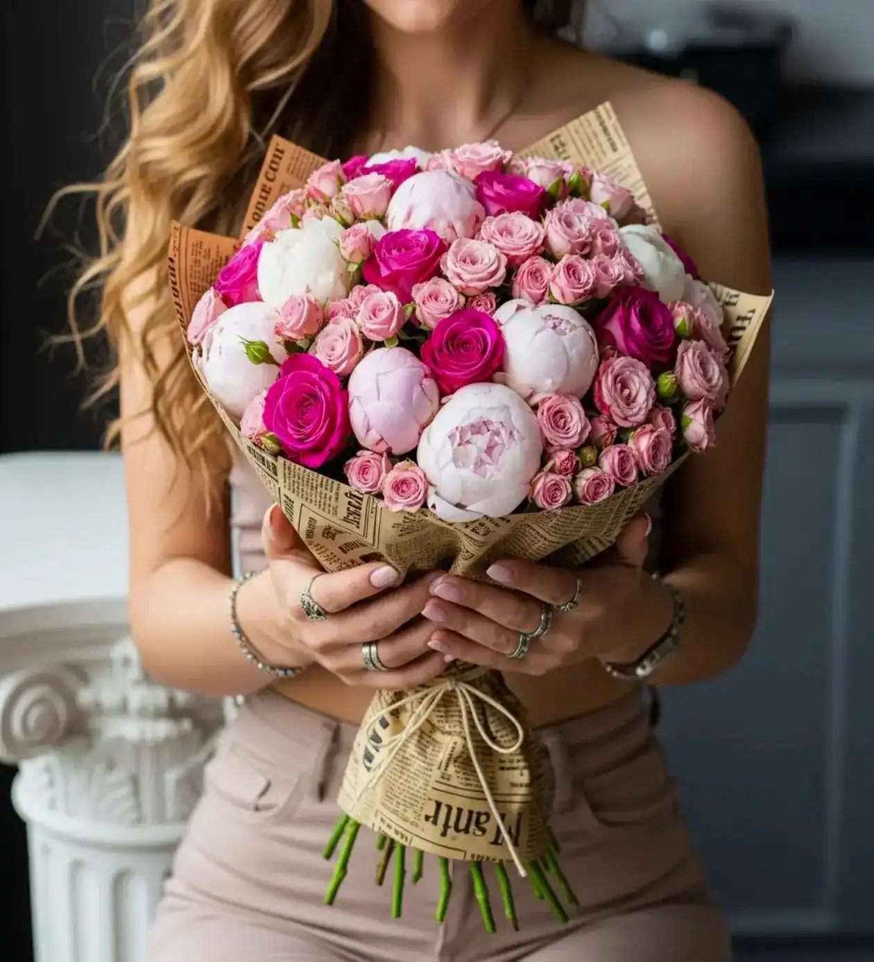 Bu büyüleyici tasarımın merkezinde, çiçek dünyasının en zarif ve lüks türlerinden biri olan pudra şakayıklar (peony) yer alıyor. Şakayıkların o katmanlı ve masalsı dokusu, aralara serpiştirilen fuşya ve soft pembe çardak güllerle (mini güller) birleşerek kusursuz bir renk paleti oluşturuyor. Buketi gerçek bir tasarım harikası yapan asıl dokunuş ise, doğal hasır iple bağlanan İngilizce gazete desenli retro ambalajıdır.
