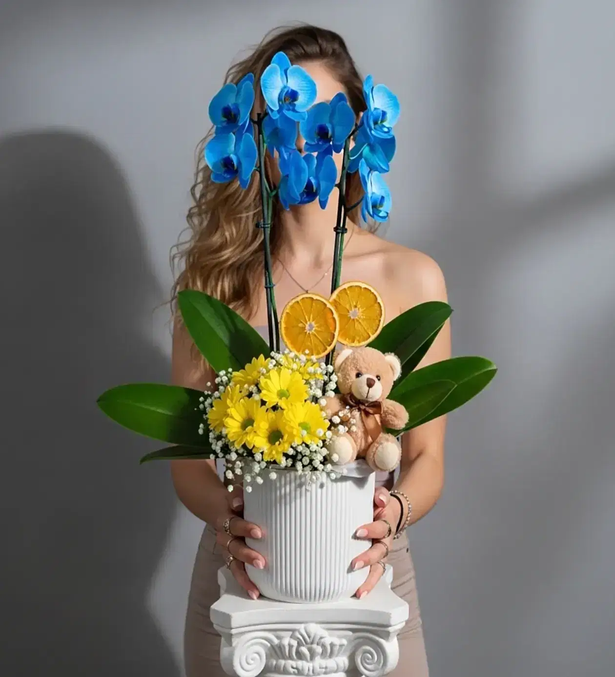 Tasarım Detayları Bu tasarımın odak noktası, nadir bulunan ve görenleri rengiyle büyüleyen Çift Dallı Mavi Orkide. Orkidenin egzotik havasını dengelemek için taban kısmında canlı Sarı Krizantemler (Kasımpatı) ve dekoratif Kurutulmuş Portakal Dilimleri kullanıldı. Çiçeklerin arasına gizlenmiş Sevimli Peluş Ayıcık, tasarıma sıcak ve samimi bir hikaye katıyor. Tüm bu kompozisyon, modern çizgili beyaz seramik saksı içerisinde, yaşam alanlarına şıklık katmak için hazırlandı.