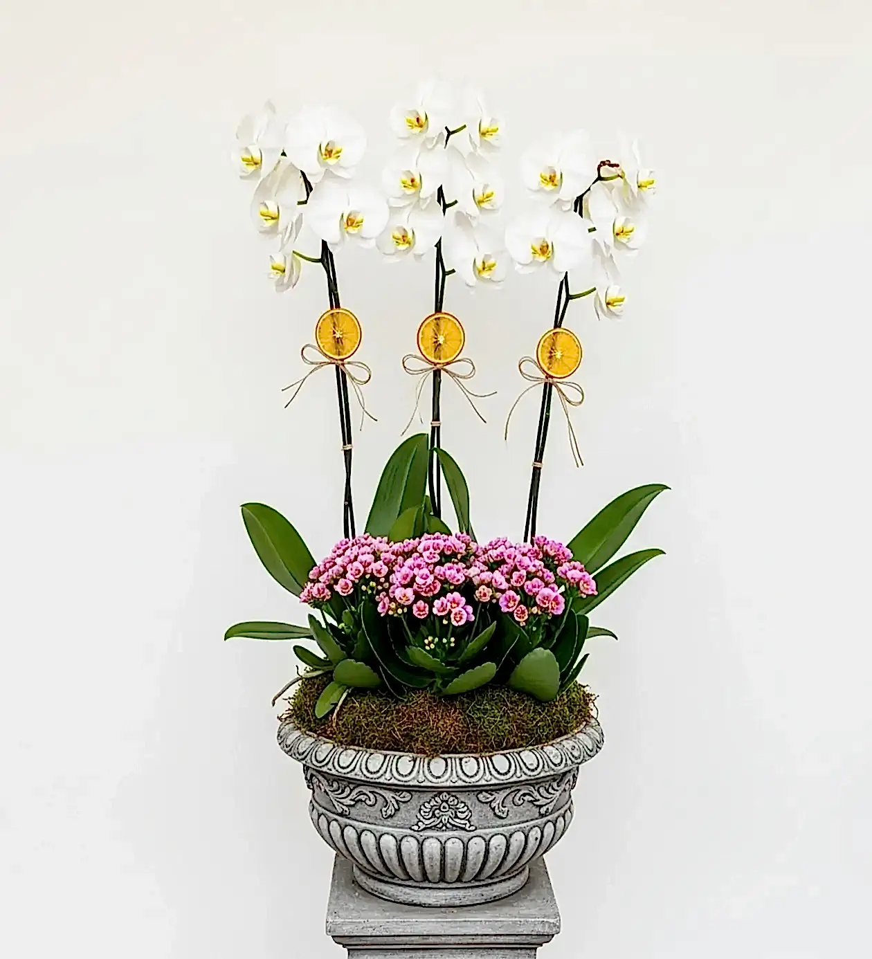 Zarafetin Işıltısı, 3 dallı göz alıcı beyaz Phalaenopsis orkide ve canlı pembe Kalanchoe bitkilerinin muhteşem uyumu ile tasarlanmıştır. Antik desenli taş görünümlü özel saksısı ile hem klasik hem de modern mekanlara estetik bir dokunuş katar.